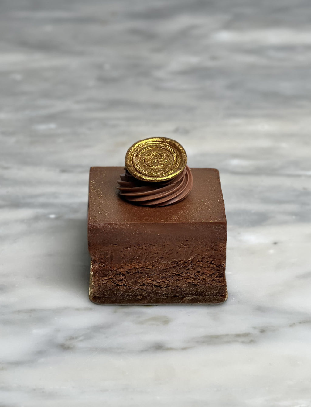 Innehåll: Mörk choklad, grädde, socker, äggula, vatten, smör, äggvita.